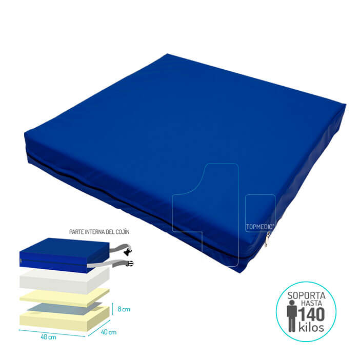 Contiene una funda donde en la parte superior es lavable y no inflamable (estadard CA 117), y la base es anti deslizante. Soporta hasta 140 kilos.